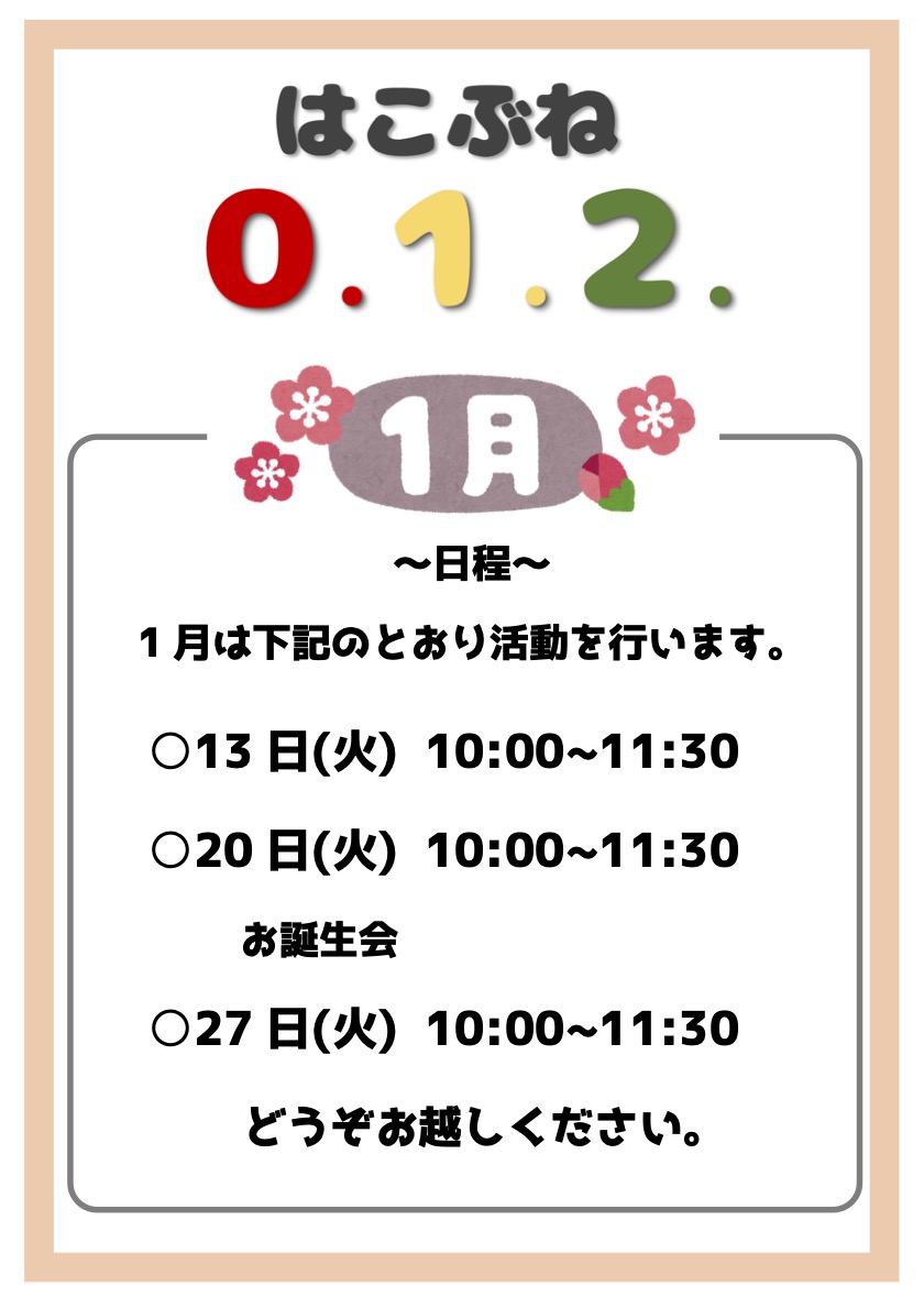 遅ればせながら、あけましておめでとうございます。2026年もどうぞよろしくお願いします。 さて、お知らせが大変遅くなってしまったのですが、1月のはこぶね0.1.2.の活動日程についてお知らせします。今月は20日(火)にお誕生会をします。よろしくお願いします。 【日程】・13日(火 […]